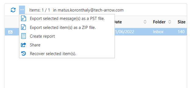 In either case, after the search has been completed, on the top of the list of matching items identified in the archive you will find three dots. Their associated menu presents you with several options – the two relevant ones being “Export selected message(s) as a PST file” and “Export selected message(s) as a ZIP file.” Note that exporting to PST files (files with the .pst extension, designating Outlook Personal Storage Files) is only possible for lists that only contain items from the email archive.