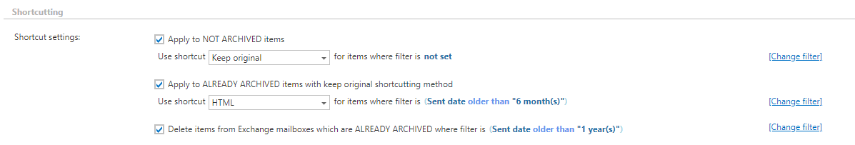 Die lang erwartete dreistufige E-Mail-Verarbeitung ist da. Sie können jetzt den gesamten E-Mail-Lebenszyklus in einem einzigen E-Mail-Archivierungsauftrag konfigurieren. Sie können einen Job erstellen, der alle E-Mails sofort archiviert, die E-Mails, die älter als 6 Monate sind, in Shortcuts umwandelt und gleichzeitig Shortcuts löscht, die älter als ein Jahr sind. Alle Verarbeitungsebenen können unterschiedliche Filter haben, sodass Sie einen beliebig komplizierten Prozess implementieren können.