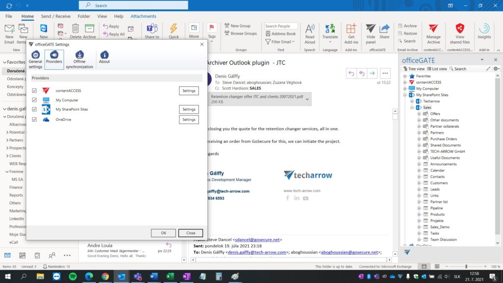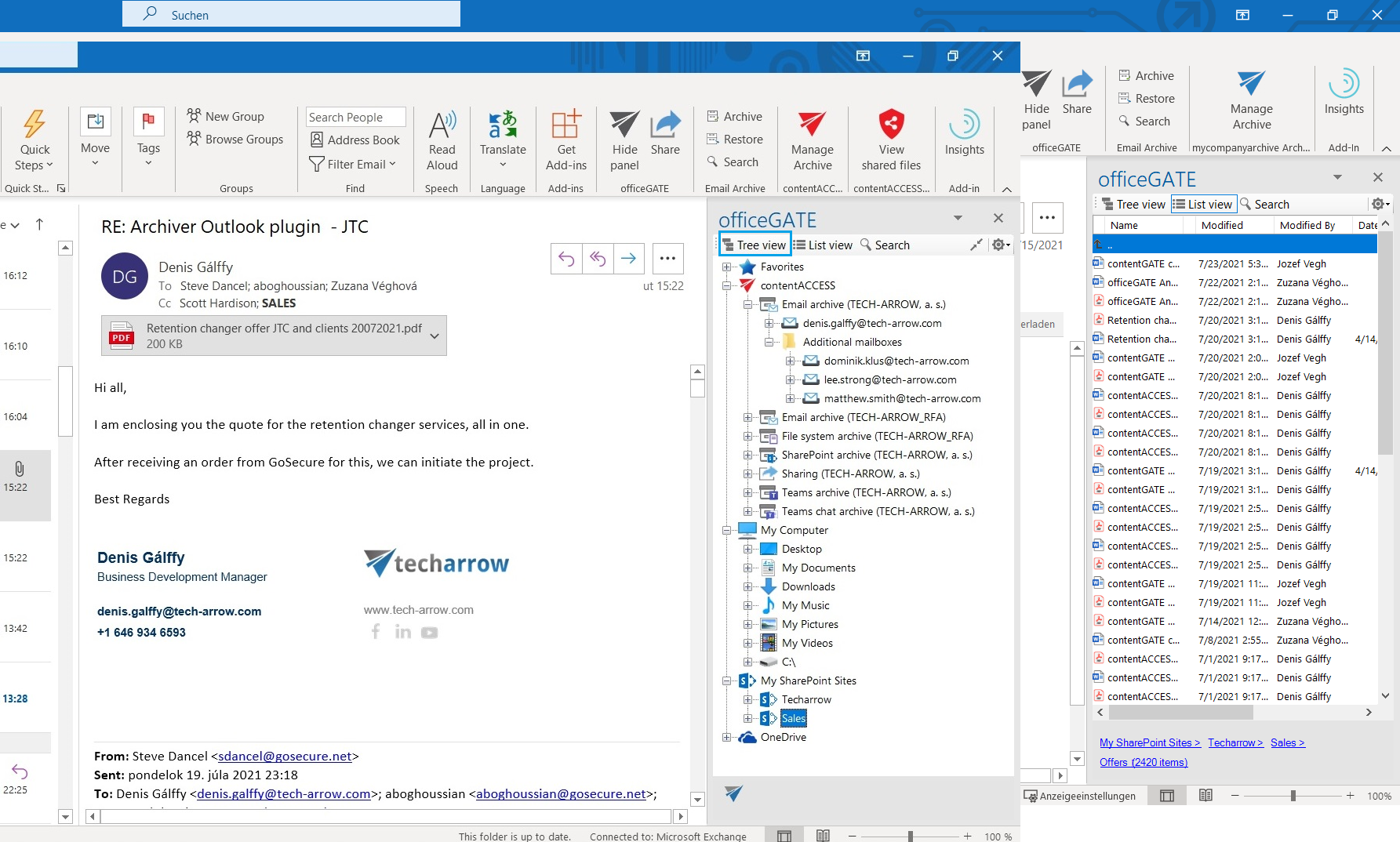 Our contentACCESS platform is a universal solution for data backup and regulatory compliant archiving of company data. It archives not only emails, but also documents, SharePoint, Microsoft Teams, OneDrive, Office 365, file servers, and desktops. Data archived in contentACCESS is accessible to all authorized users via officeGATE in Microsoft Outlook.